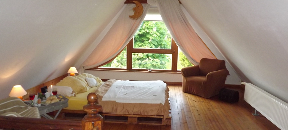 Der absolute “Romantiker” unter den Wohnungen, mit einem Bett (1,40 x 2m) aus Europaletten und traditioneller Deckenhöhe.