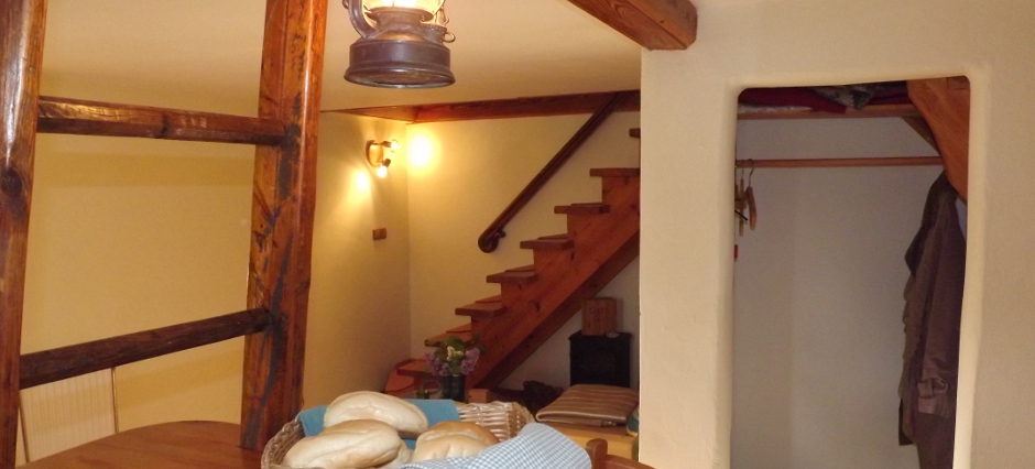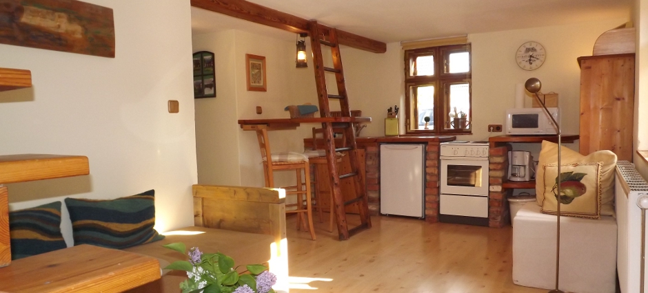 kleines Bad mit Dusche / WC, kombinierter Wohn-Kochbereich mit Esstresen, kleine Couch und TV, voll ausgestattete Küchenzeile mit Herd und Backofen, Toaster, Kaffeemaschine, Mikrowelle und Wasserkocher. Der “Stall” ist ein über 100 Jahre altes Gebäude und hat im Erdgeschoss die traditionelle Deckenhöhe von 1,95 m.